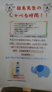 久しぶりに『しゃべる時間』やります!日ごろ、診療中に話せない歯科の面白話やためになる小ネタをお話させていただきます。(日時)9月29日土曜日 pm5:00から (場所)田島歯科裏、ダンスクリニック (参加費)無料 来て頂いた方には歯みがきセットプレゼント!